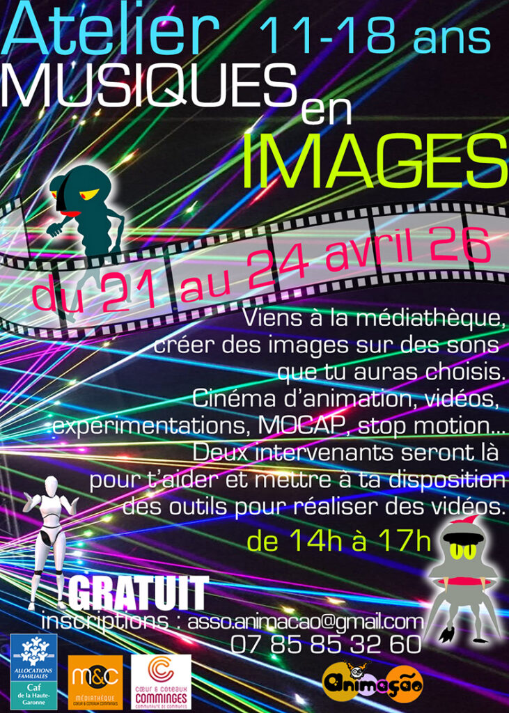 Durant 4 demi-journées de 14h à 17h, un groupe de jeunes de 11 à 18 ans va se retrouver, accompagnés par deux intervenants de l’association Animação, afin de créer des images animées à partir de musiques découvertes à la médiathèque de Saint Gaudens.